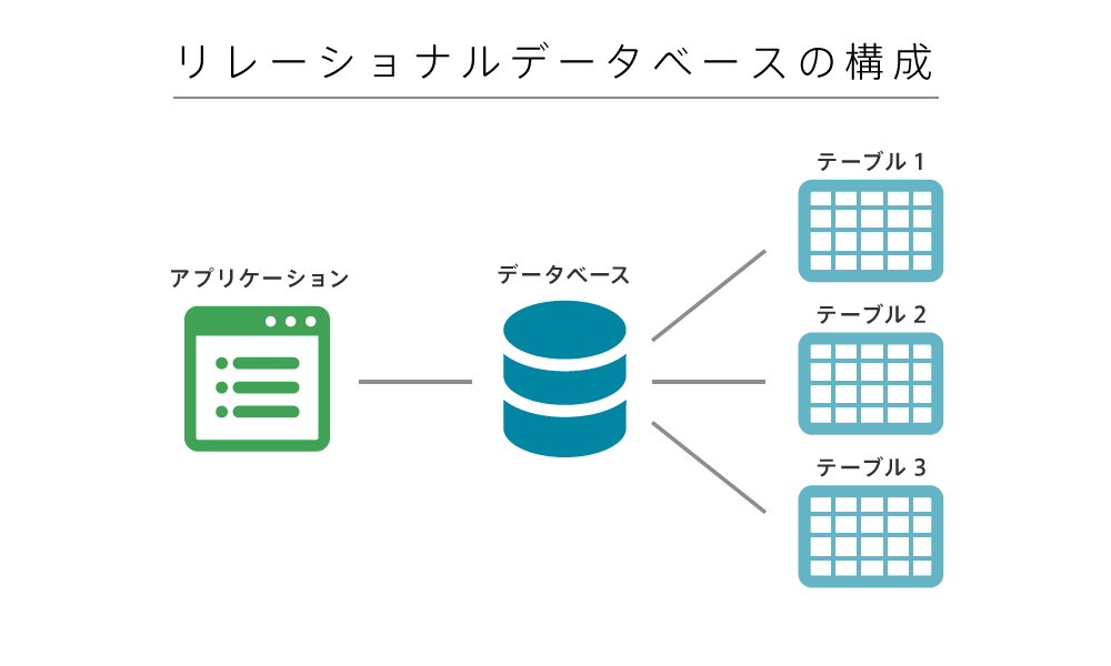 リレーショナルデータベースの構成は、基本的に1つのアプリケーションに対して1つのデータベースがあり、1つのデータベースの中に複数のテーブル(表)があります。