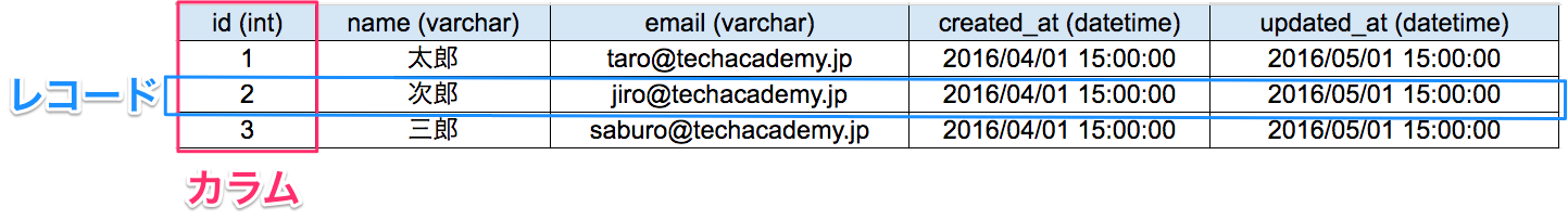 下記のテーブルであれば、ユーザーテーブルのレコードは3件あり、「idカラムの値」が 2 のレコードの、「nameカラムの値」は 次郎 となります。