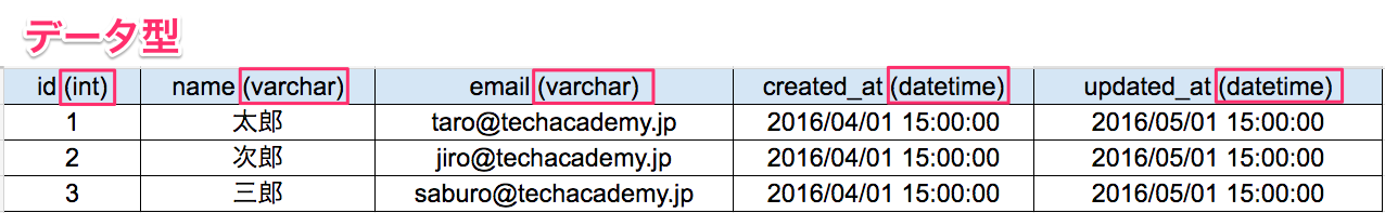 下記のテーブルであれば、idには int という整数型が、nameには varchar という文字列型が設定されています。カラムで指定された型以外の値を含んだレコードは保存が失敗するようになっています。