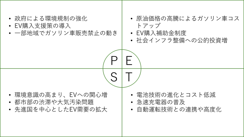 このように分析することで、EV事業に対する機会(規制強化、補助金、環境意識の高まりなど)とリスク(インフラ投資の遅れ、技術力の有無など)が明確になります。