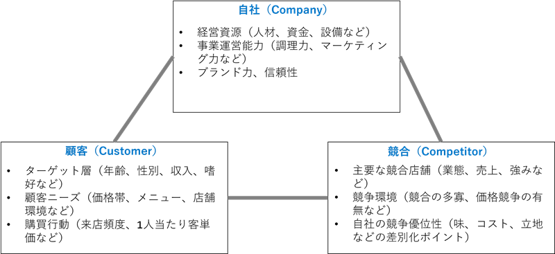 ある飲食チェーン店が新規出店を検討している場合を例に3C分析を行ないます。