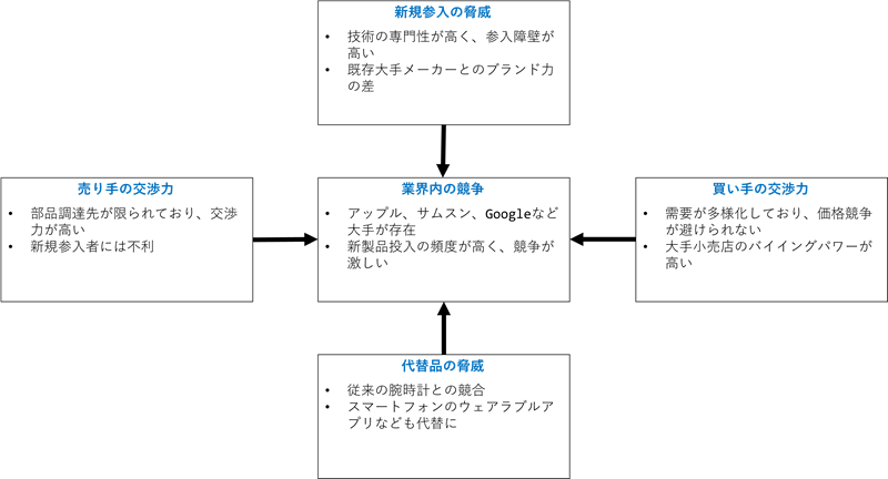 このように分析を行なうことで、スマートウォッチ業界への新規参入の障壁が高く、競争が激しいこともわかります。一方で、ウェアラブル市場の成長が見込まれるため、参入のチャンスもありそうです。